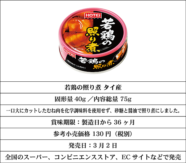 株式会社ホテイフーズコーポレーション(静岡市清水区、代表取締役社長:山本達也)は、化学調味料不使用、砂糖と醤油で、若鶏のむね肉を柔らかく仕上げた「若鶏の照り煮」を3月2日(火)より、全国発売します。