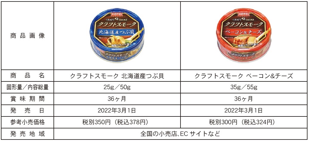 株式会社ホテイフーズコーポレーション(静岡市清水区 代表取締役社長 山本達也)は、手仕事感にこだわって燻製したおつまみ「クラフトスモーク 北海道産つぶ貝」、「クラフトスモーク ベーコン& チーズ」の2品を2022年3月1日(火)より、全国発売します。